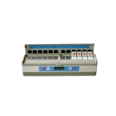 2、裝片。將速測卡撕去蓋膜對折后再展開,插入壓紙條下的各通道加熱板上(注意紅色藥片一端在上方,白色藥片一端在下方),檢查速測卡放置位置是否正確,速測卡中間的虛線應與壓條對齊,不要歪斜。