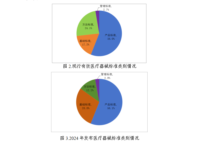 2.標準體系結構更加完善。按標準規(guī)范對象統(tǒng)計,現(xiàn)行有效醫(yī)療器械標準中基礎標準349項(占比17.2%);管理標準54項(占比2.7%);方法標準488項(占比24.1%);產(chǎn)品標準1132項(占比56.0%)(見圖2)。2024年發(fā)布基礎標準40項(占比28.8%);管理標準4項(占比2.9%);方法標準17項(占比12.2%);產(chǎn)品標準78項(占比56.1%)(見圖3)。